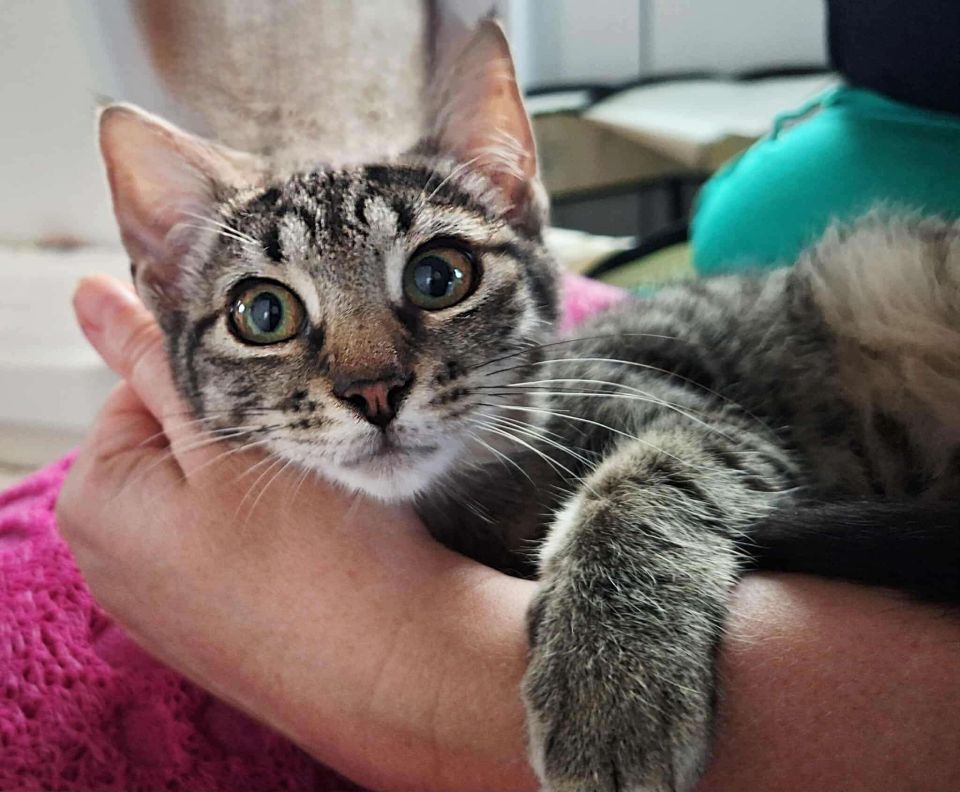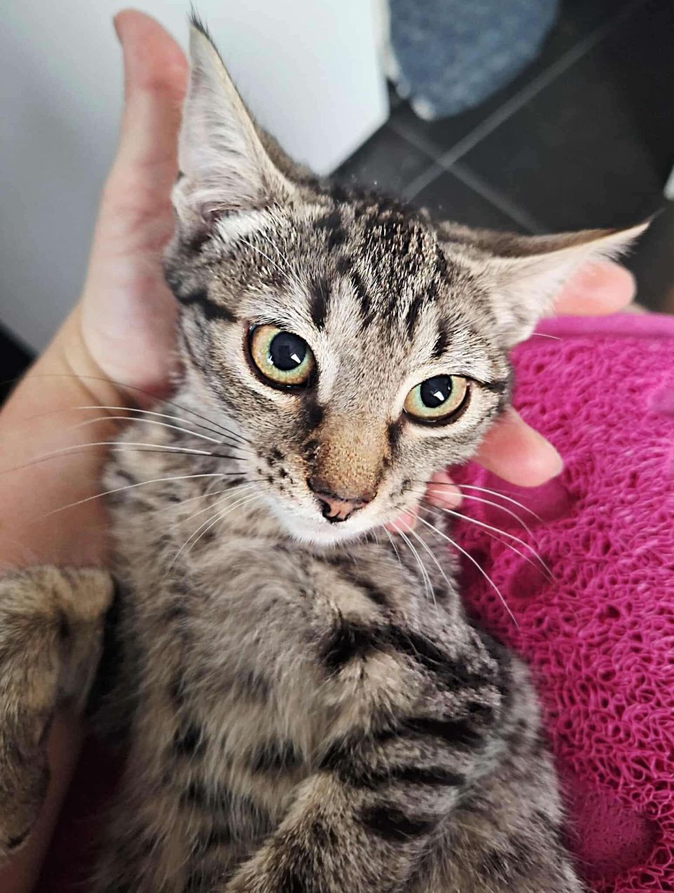 Bonjour, je m’appelle Raïna. Je suis une jeune chatte tigrée, fine et discrète, avec un regard toujours curieux sur le monde. On m’a trouvée dans une ferme abandonnée avec mes frères et sœurs. Tout m’a longtemps paru trop grand et trop bruyant… et j’ai appris à me protéger comme j’ai pu. Je suis encore assez timide : je sursaute au moindre bruit, je me cache facilement et il m’arrive encore de souffler quand j’ai peur. Mais si vous me parlez doucement, si vous respectez mon rythme, alors quelque chose en moi s’ouvre. Quand je me sens en confiance, je me laisse câliner, je ferme les yeux… et j’en profite vraiment. Je ronronne même très fort. J’ai trouvé du réconfort auprès de Juliette, la chatte adulte de ma famille d’accueil, qui m’aide à comprendre que la vie peut être tranquille. Une copine chatte douce serait un plus pour moi, mais ce n’est pas obligatoire. Ce qu’il me faut, c’est un foyer calme, sans jeunes enfants, où l’on m’offre un refuge et le temps d’être moi-même. Avec patience et douceur, je deviens une petite chatte attachante, reconnaissante et câline… mais seulement quand je me sens en sécurité. Si vous cherchez un lien tendre, discret, et sincère… peut-être que je suis celle que vous attendez. Je vous attends à Vaux-et-Borset.