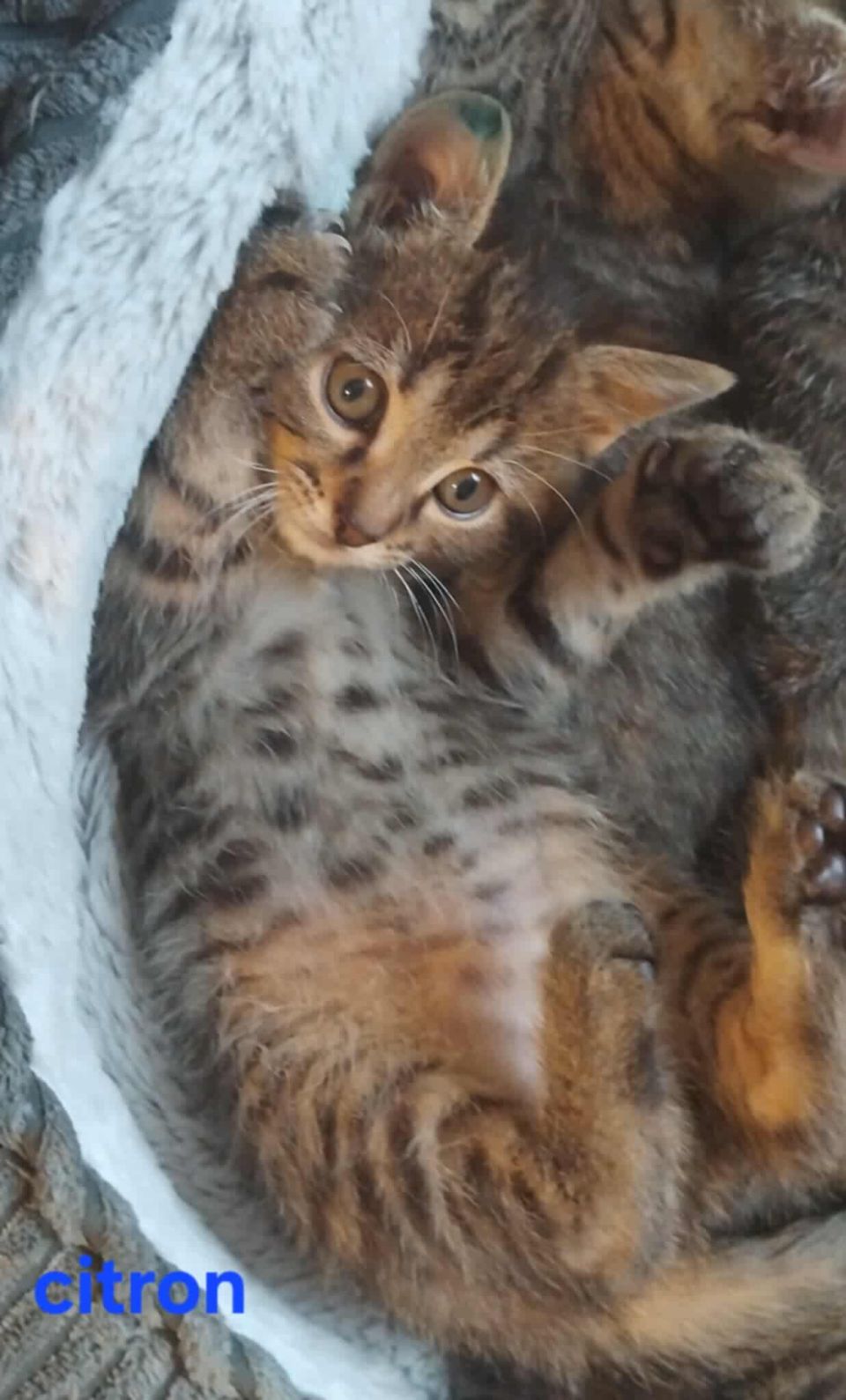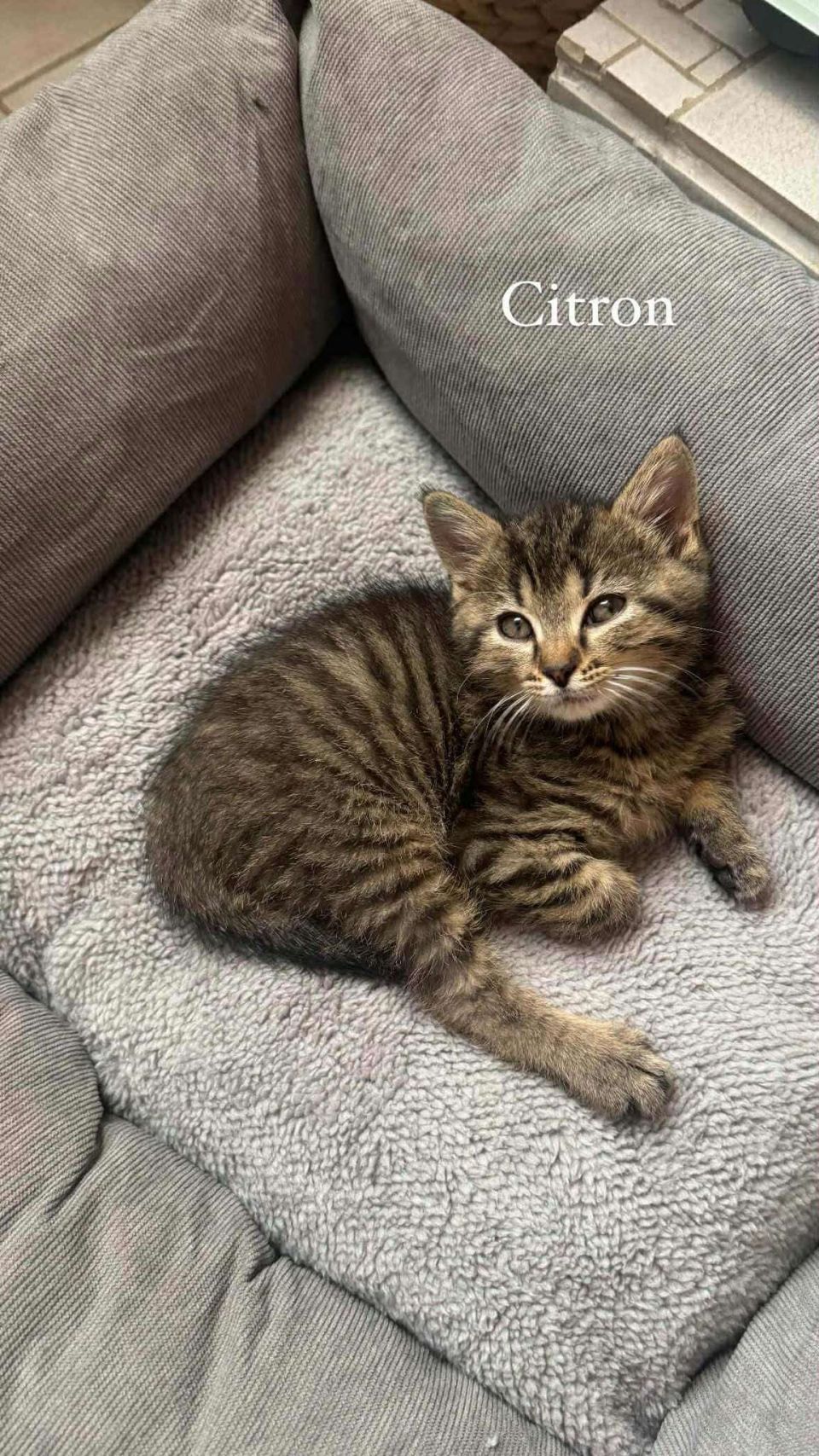 Citron est le seul petit mâle de sa portée, et il a su très tôt se faire remarquer ! C’est le plus foncé de tous, et aussi le premier à avoir voulu tout explorer autour de lui. Un vrai petit aventurier au départ !
