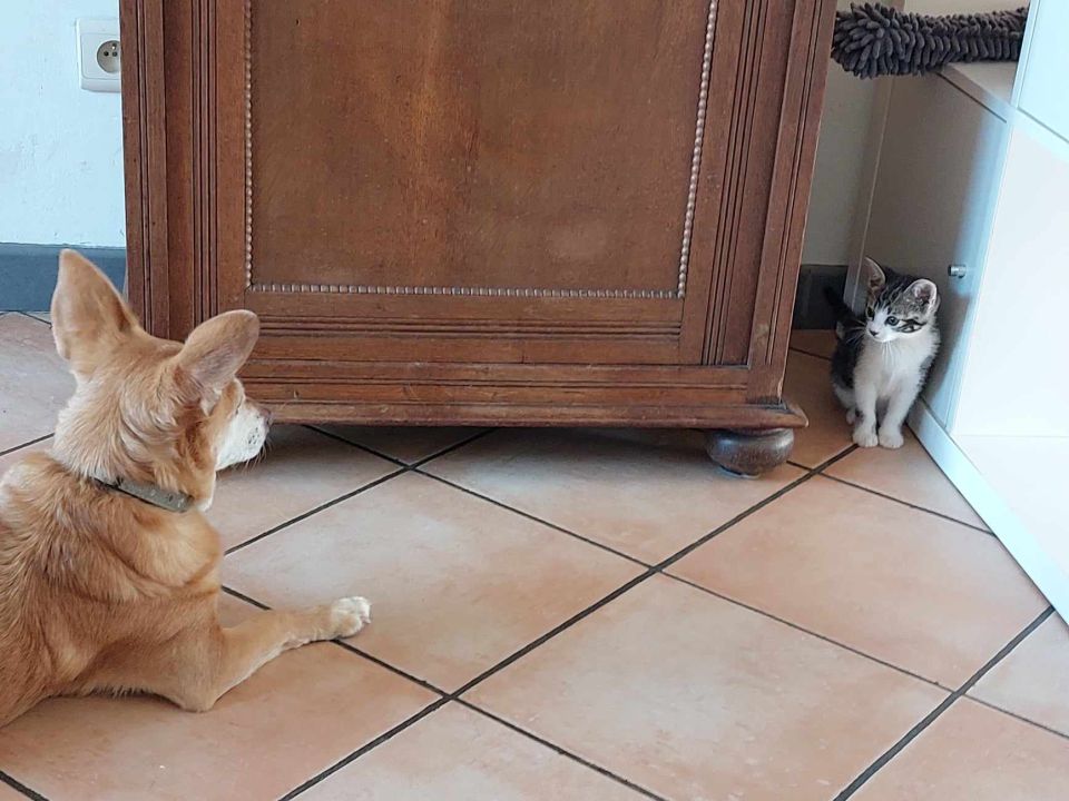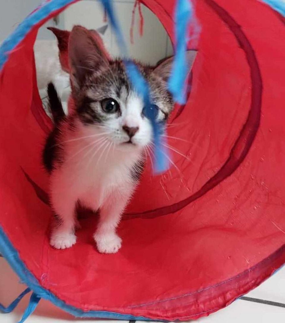 Coucou, moi c’est Dina. Je suis née le 3 août dans une remise abandonnée, d’une maman errante. J’ai été trouvée à 4 semaines avec mes frères et soeurs, malheureusement notre maman ne s’est pas laissée attraper. Nous n’étions pas encore sevrés mais après quelques jours de biberon j’ai commencé à manger toute seule. Je suis une petite chatte espiègle et vive et je joue comme une folle avec mes frères et sœurs. Tout est prétexte à courir et sauter partout, ma queue est une proie passionnante et je fais plein de bêtises.