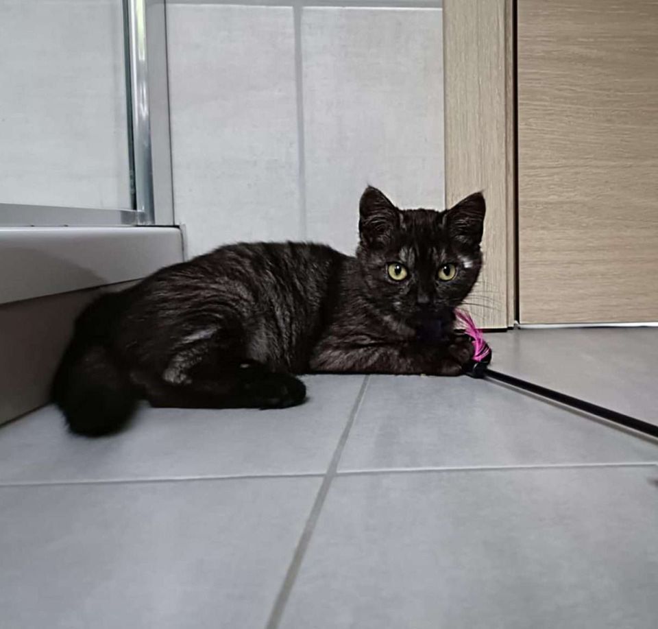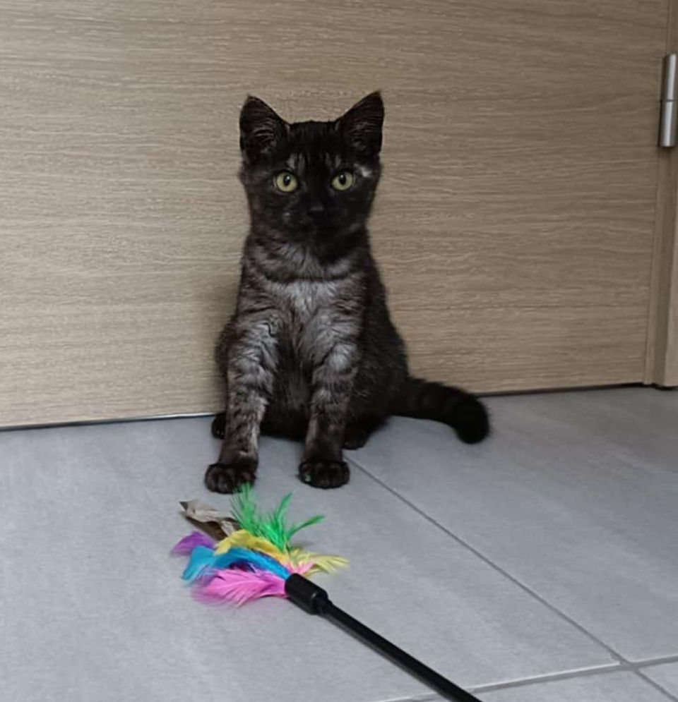 …je suis une petite femelle d environ 2 mois et demi ..j ai été trouvée errante du côté de Waimes et une fois arrivée chez ma maman d accueil j étais un peu timide mais aujourd’hui j ai appris à faire confiance et j adore nos moments câlins mais surtout le moment du repas et des jeux
