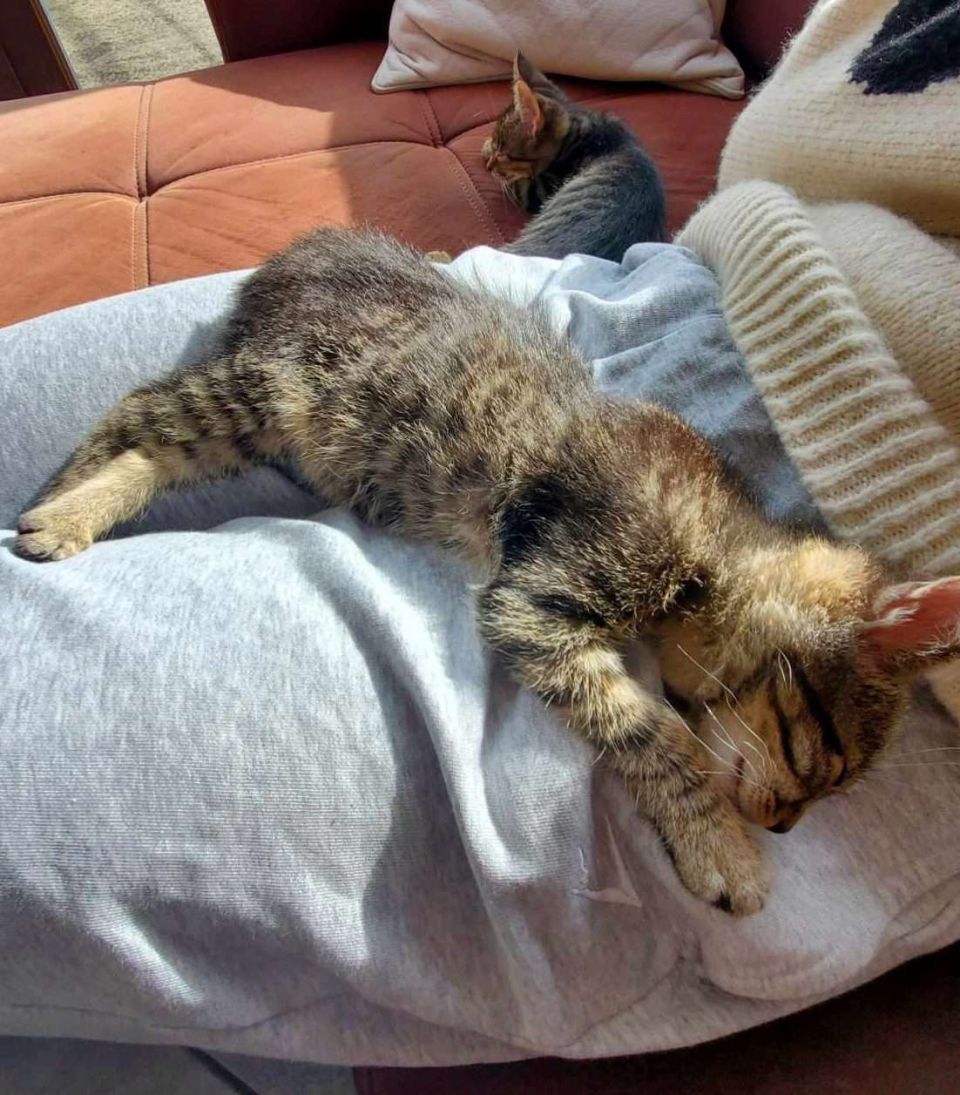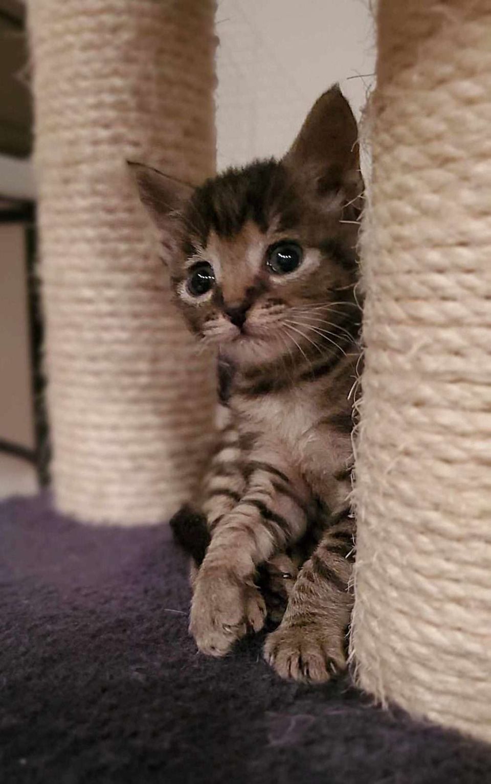 . Nous avons grandi avec une autre maman adorable et ses 6 chatons, les Friends (si vous vous souvenez) qui avaient notre âge et pesaient 300g de plus pourtant. Et devinez qui gagnait lors des courses-poursuites? Idem pour l’accès à la nourriture, je suis un lutteur hors pair. Mon frère va être adopté avec un des Friends, donc je ne parle plus que de moi. Je suis un chaton hyper câlin, j’adore me lover sur le premier qui s’assied. Je suis intrépide, gourmand, très joueur. Et j’ai l’art de grimper le long des jambes (avec ou sans pantalon