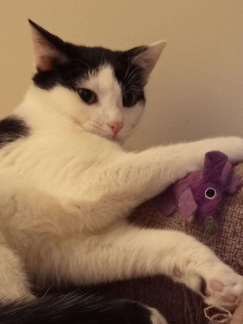 Je viendrai vers vous , mais petit à petit, mes ronrons se rapprocheront d’une main câlinant et respectueuse Je suis discrète et je viens près de vous quand c’est ok pour moi et je peux rester dans les bras, mais juste pas très longtemps. Le soir, je fais la java avec toutes les petites balles avec les autres chats. J’aimerai vivre avec un autre chat sympa qui saura me montrer le chemin ou avec mon frère Dali