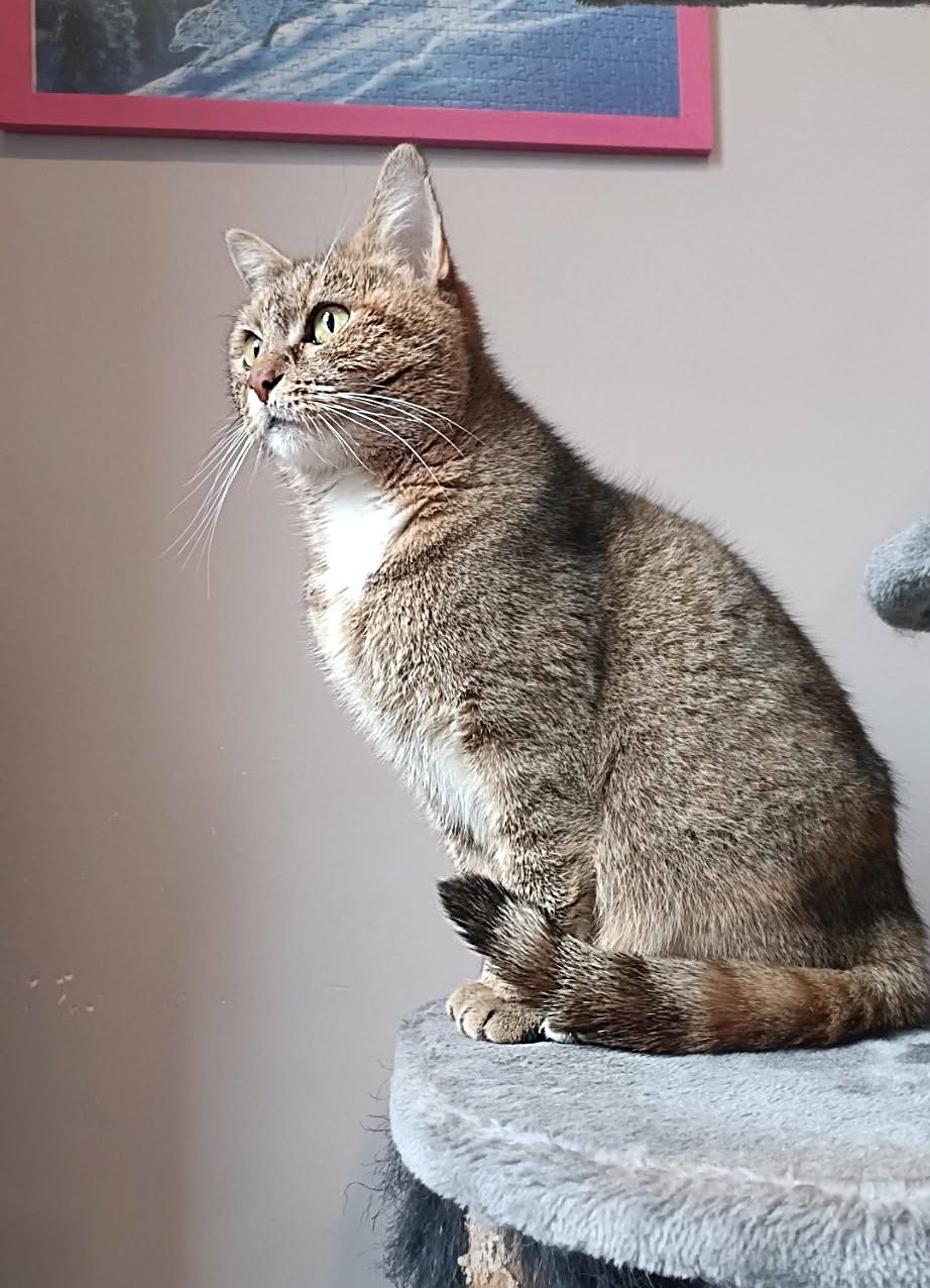 Bounty est une chatonne très craintive, mais très attachante. Grande observatrice, gourmande et joyeuse, elle aime la tranquillité et les repères. Elle apprécie les câlins, mais à petite dose et selon son envie. Elle ne se laisse pas porter et a besoin que ses limites soient respectées.