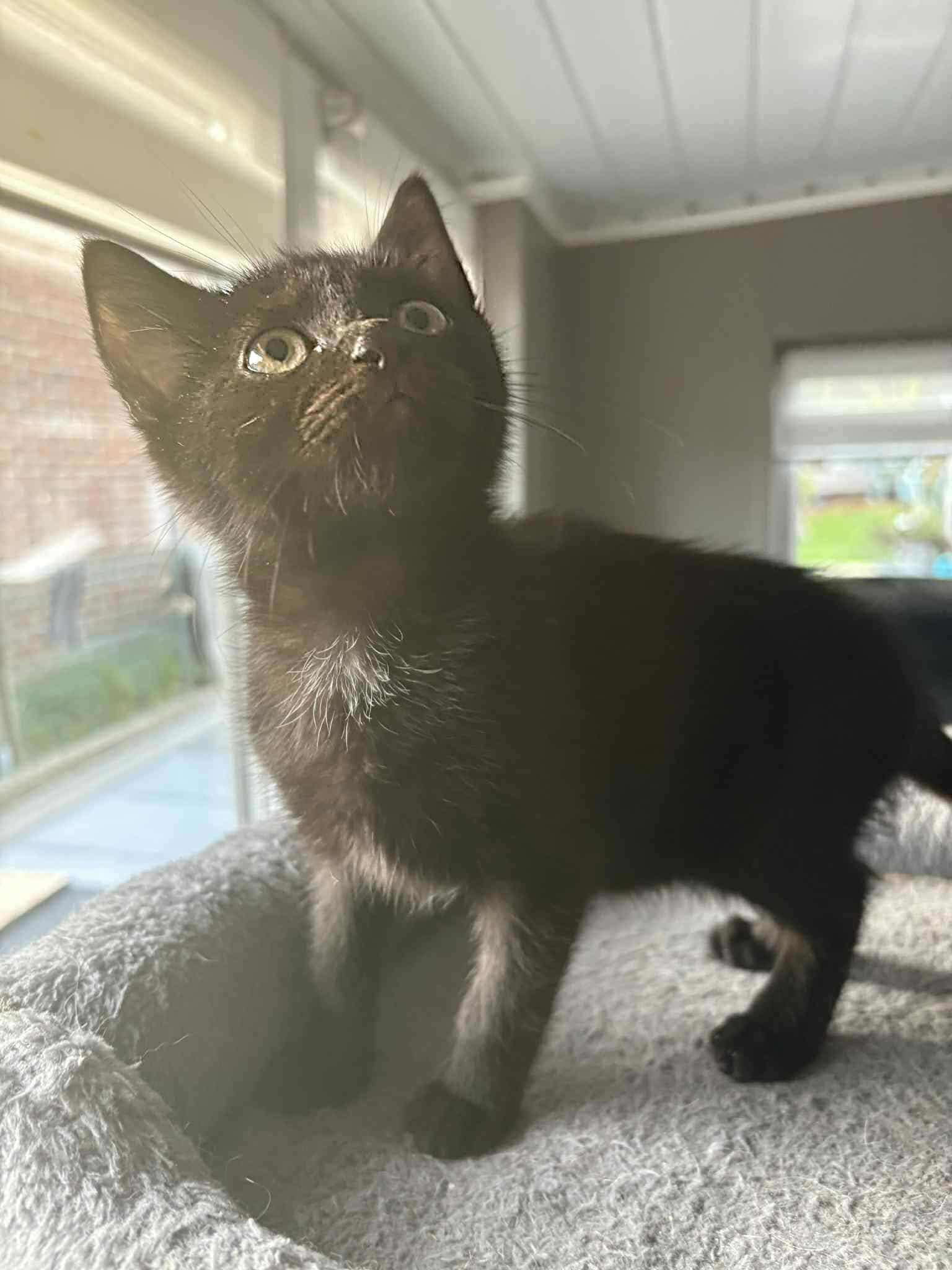 Comme toute la fratrie, elle a été biberonnée depuis ses 7 jours, ce qui en fait une chatonne très proche de l’humain, habituée aux manipulations et en recherche d’affection.