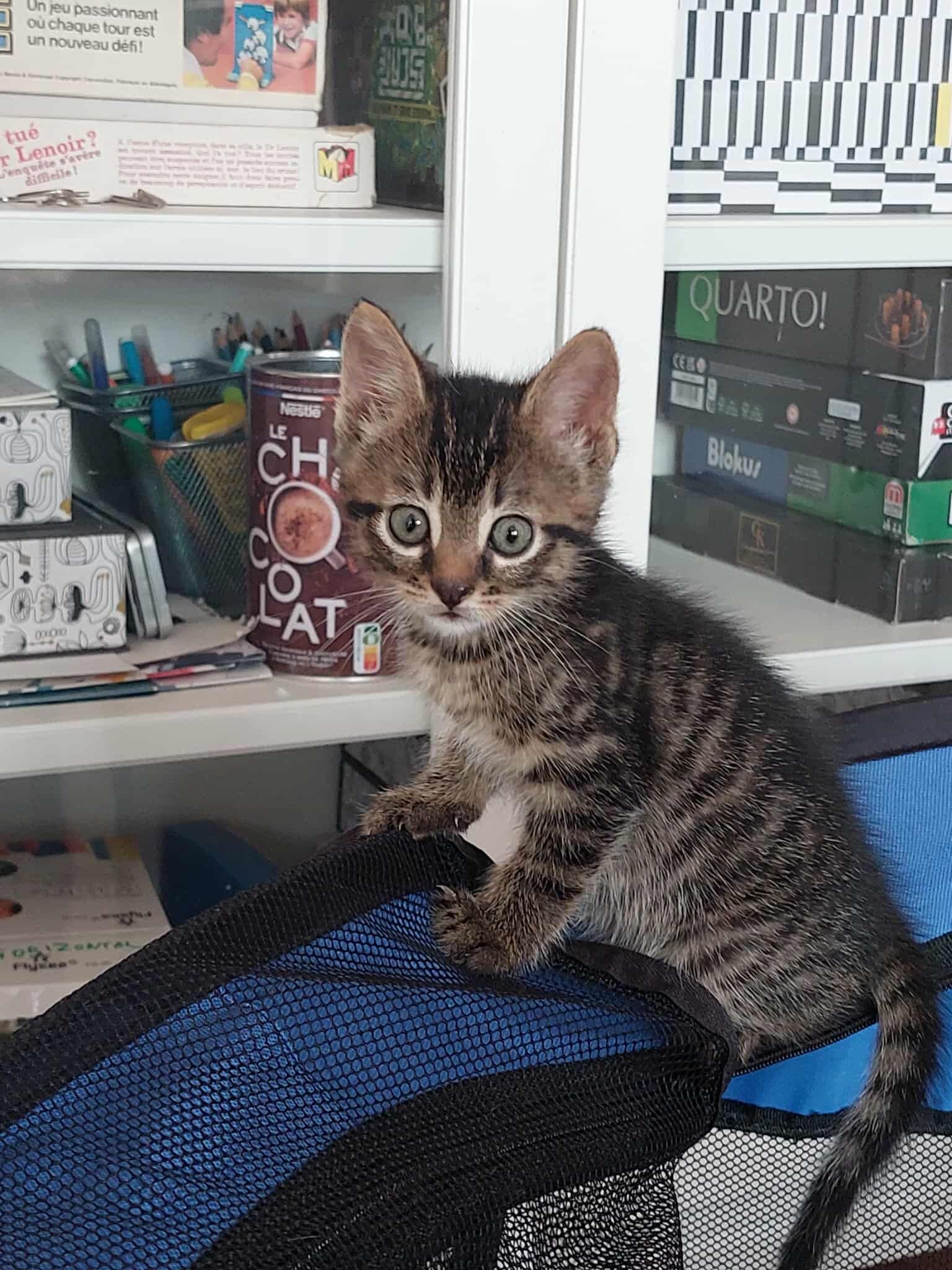 Moi c’est Tsunami, une mini tornade pleine de curiosité ! J’adore grimper, courir, renifler, fouiller… Je veux tout voir, tout comprendre, tout explorer ! Ma maman d’accueil adore mes petites taches noires sur le dos. C’est trop beau, il parait !