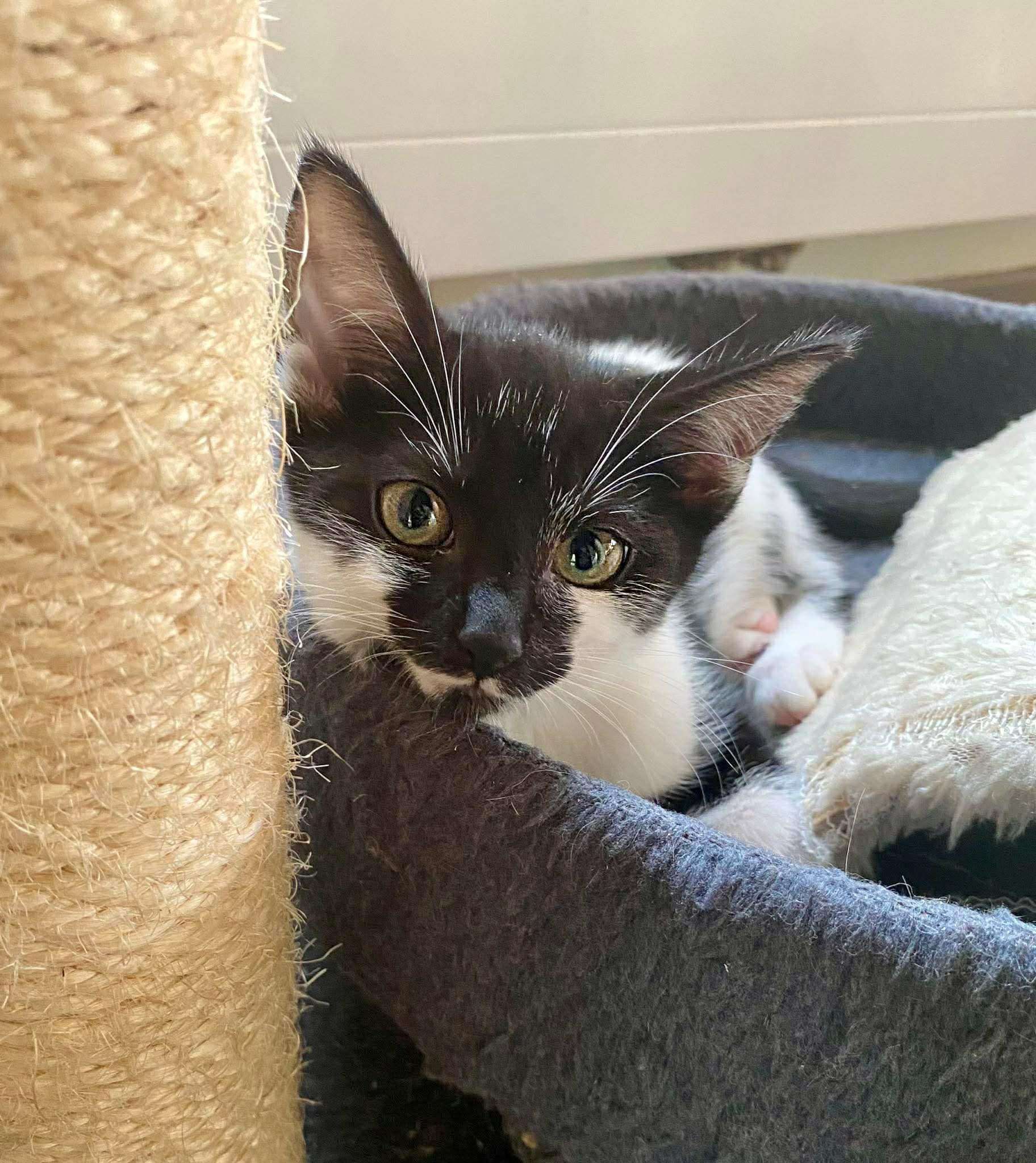 🐾 Abri(cot) est un adorable chaton plein d’énergie et de gourmandise ! Très joueur et curieux, il garde malgré tout un côté timide. Il aura donc besoin de temps pour apprivoiser ses nouveaux humains… mais une fois en confiance, préparez-vous à l’avoir souvent près de vous, endormi à vos pieds, que ce soit dans le lit ou pendant que vous travaillez.