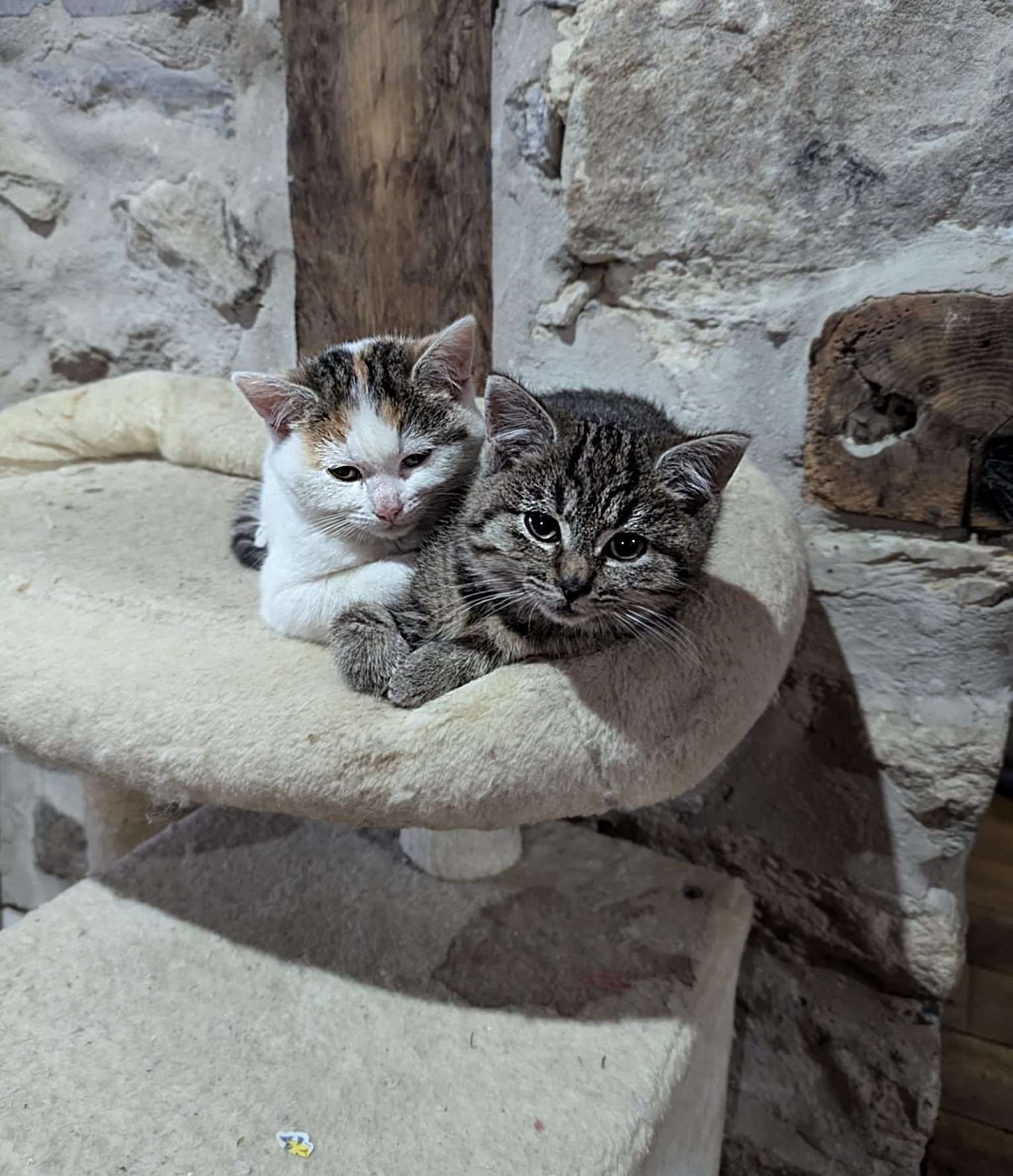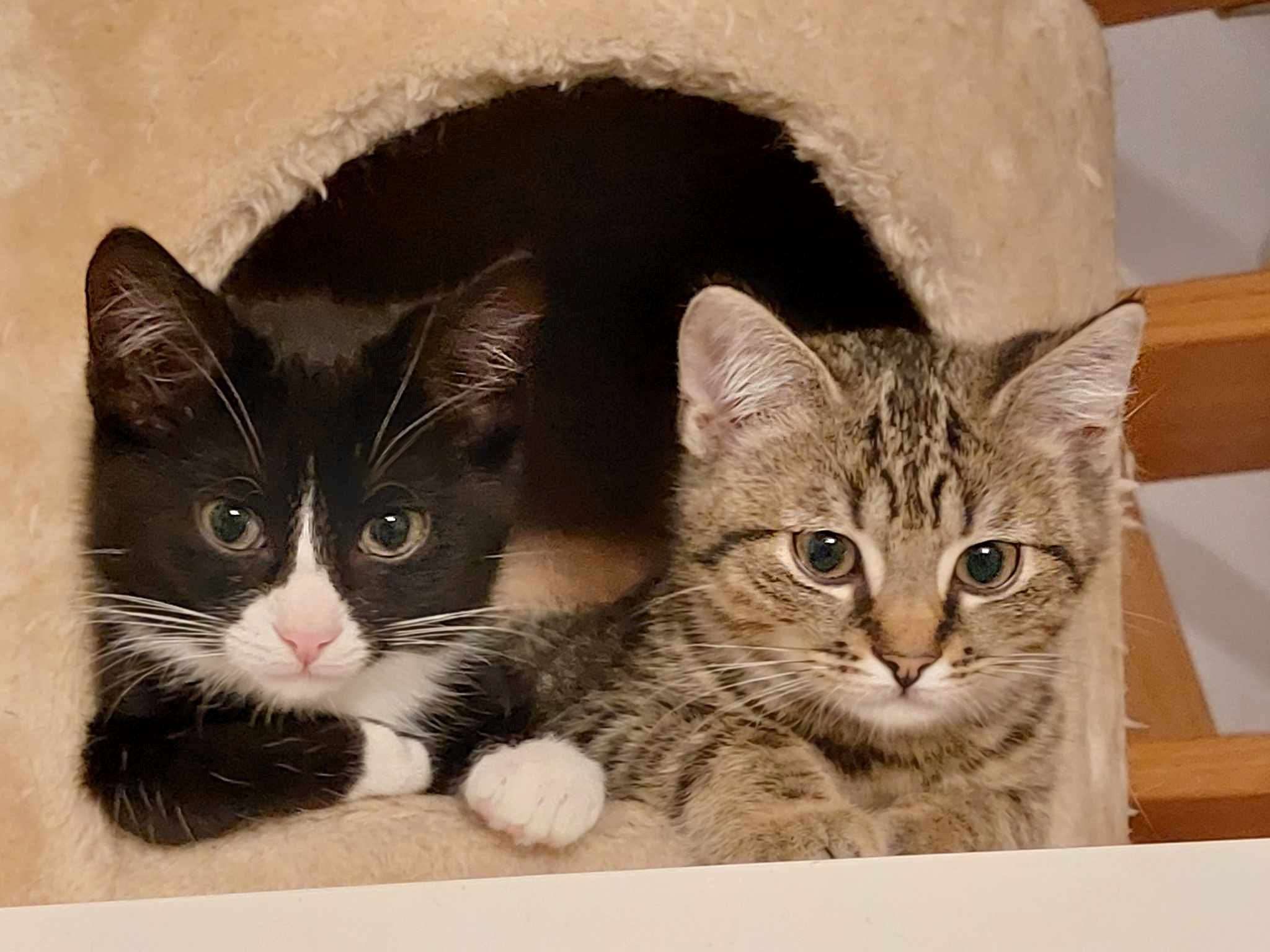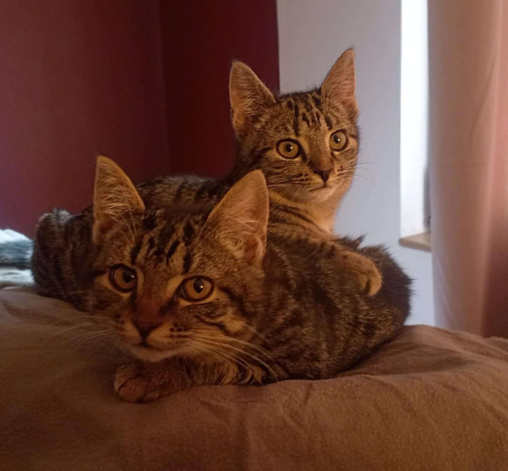 . Nous sommes deux chatons très doux , très calmes avec énormément d’amour à partager, nous sommes les compagnons parfaits.  Nous adorons jouer avec nos jouets ainsi que avec notre soeur et notre frère . Nous sommes toujours tous les deux collés et donc inséparables. Les moments de jeux comme les moments de siestes et même pour manger nous faisons tout à deux 🙂 . Nous sommes deux petites boules de poils toutes mignonnes, mais pour que nous soyons épanouies nous devons avoir de la présence d’un humain à la maison . Nous sommes des fois un peu perdu exemple : nous savons monter les escaliers mais Yoshi n’a pas envie de descendre tout seul il miaule pour appeler l’ascenseur « , notre maman d’accueil  » lol . La nuit nous sommes dans la chambre dans notre panier pour faire plein de beaux rêves près de notre maman d’accueil. Une fois que le soleil se lève nous aimons avoir notre câlin, ensuite nous prenons notre petit déjeuner et choisissons ce que nous allons faire de notre journée. Nous sommes des chatons qui ne devrons pas sortir !!  Déjà parce que cela serait trop dangereux pour nous , car nous n’avons aucune conscience des dangers et à cause de notre frimousse des mauvaises personnes pourraient nous chatnapper 🙁