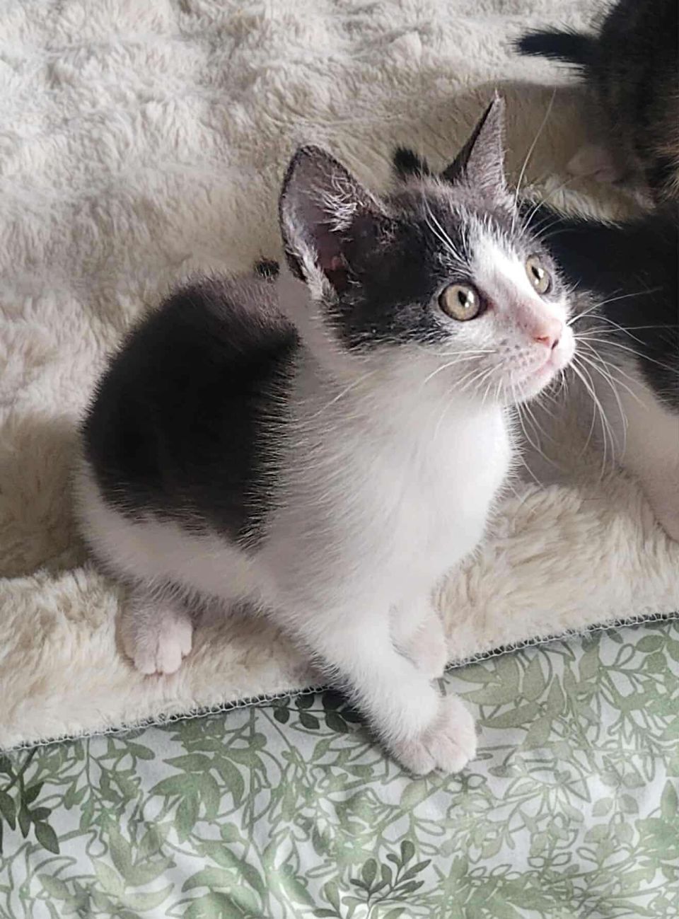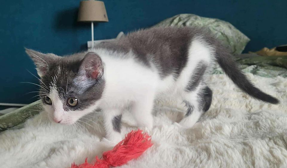 Je suis une jolie petite femelle grise et blanche, née fin avril. J’ai de magnifiques yeux gris et deux petites particularités : une tache grise sur le bout du nez et une jolie tache ronde sur le ventre. Trop mignonne, non ?