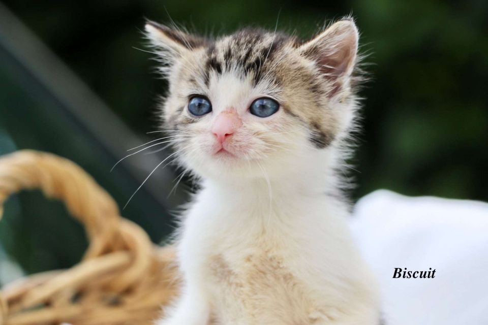 Biscuit est le petit frère au regard doux. Un peu plus posé que ses sœurs Biscotte et Balzan (mais ça ne dure jamais longtemps !), il observe avant de foncer à son tour. Très sociable et affectueux, il vient facilement chercher les câlins et se met à ronronner dès qu’on le touche. Il est à l’aise avec les chiens calmes.