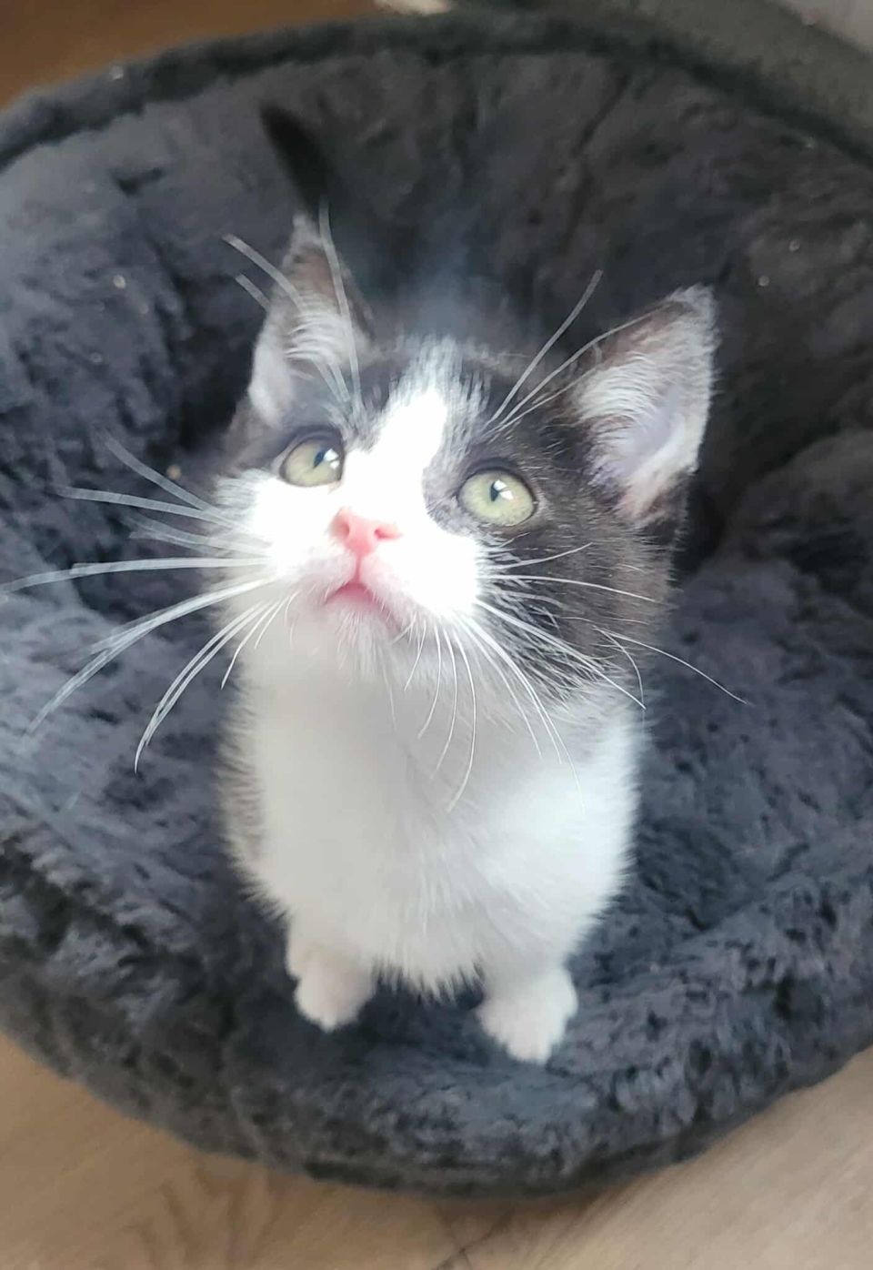 Je suis un petit mâle noir et blanc, né fin avril, avec un adorable nez rose et de beaux yeux gris brun clair. Je suis craquant et je le sais bien !