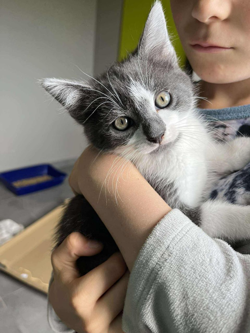 Moi, c’est Grisou, un magnifique chaton blanc et gris perle. Je suis aussi tout doux et très gourmand… Dès que je sens l’odeur de la pâtée ou des croquettes, je débarque en courant ! 😋