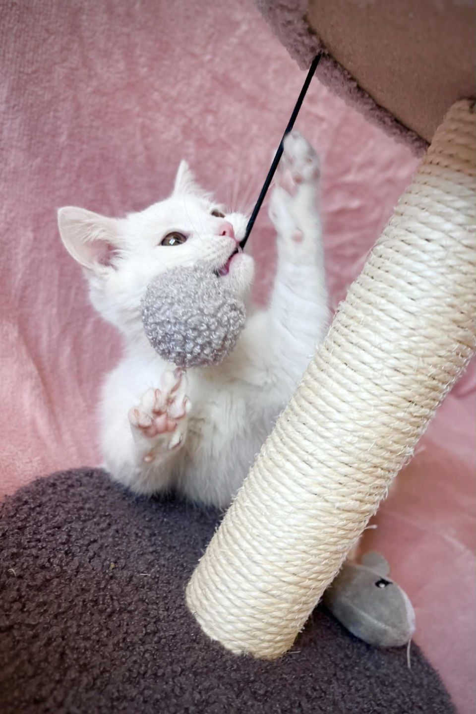 Je suis un bébé et j’adore découvrir, courir, jouer et surtout ennuyer gentiment les chats d’Amber. Je suis enfin prête pour mon adoption! J’aimerais un moins un(e) ami(e) chat parce que j’aime beaucoup jouer et interagir. J’ai besoin d’une famille qui soit attentive et qui ne laisse pas sortir les chats parce que j’ai une particularité: je suis sourde! Du coup les dangers de l’extérieur sont décuplés pour moi! À part ça, je vis ma vie normalement. Il faut juste apprendre à communiquer autrement. Dès que ma pote bipède se met dans le canapé je me met sur elle et je ronronne. Je suis une pot de colle et je regarde tout ce qu’elle fait