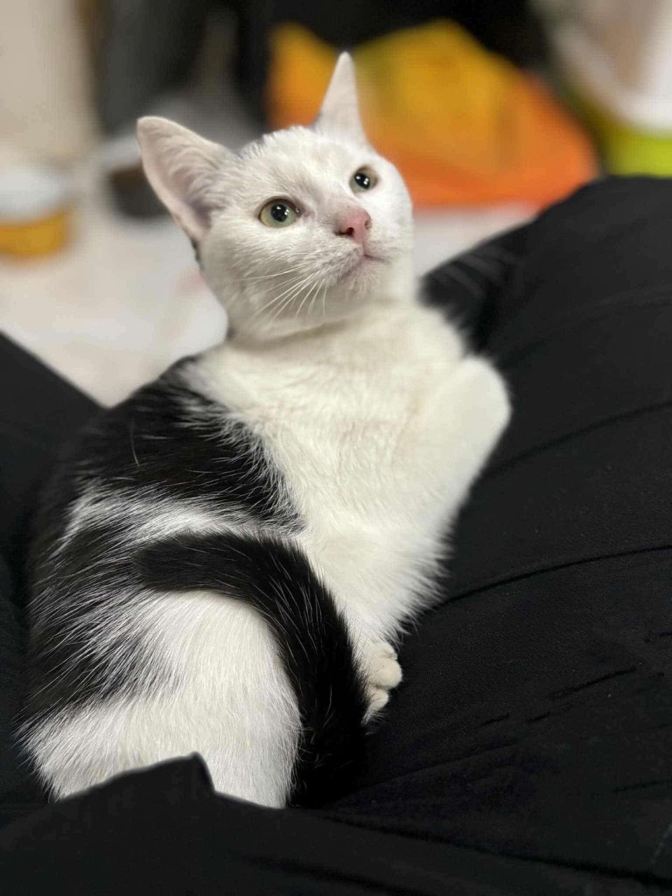Kanon. Ce petit chaton est une vraie boule d’amour : super câlin et véritable machine à ronrons, il vient chercher les caresses et aime rester près de vous.