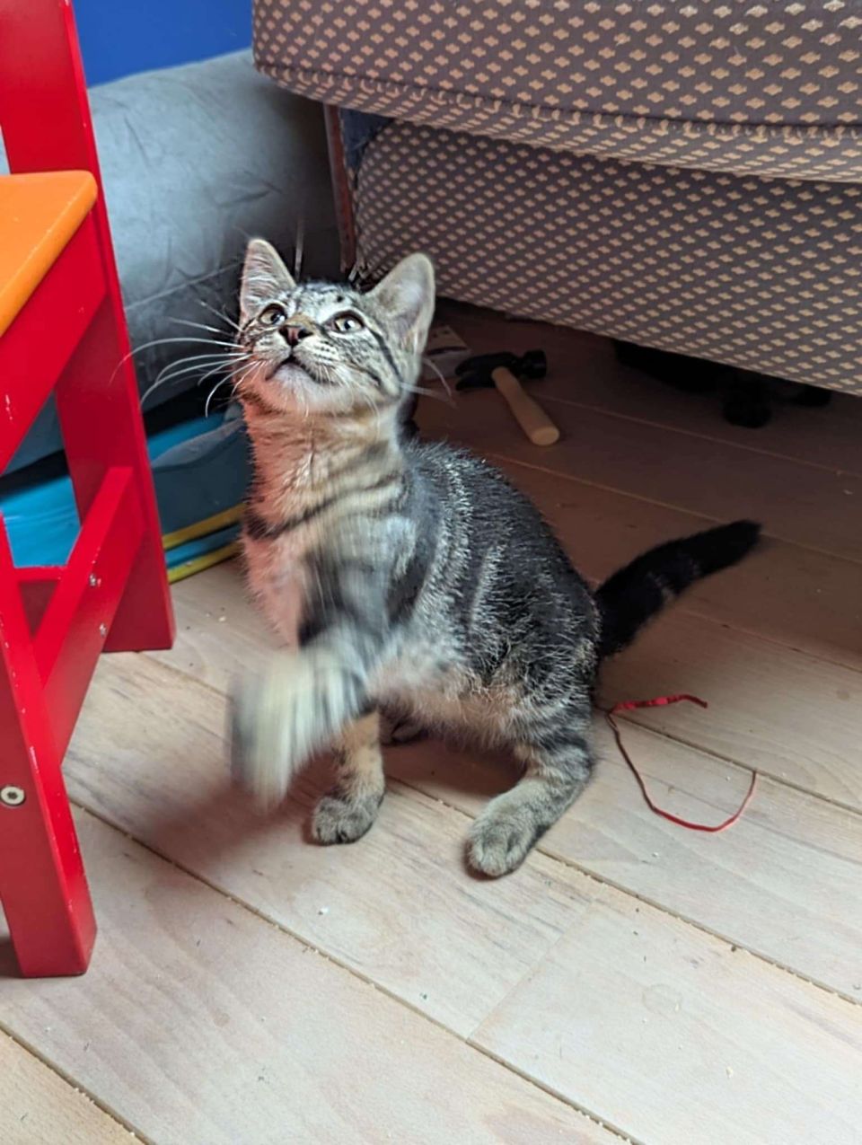 Toujours prêt pour une partie de chat perché, il grimpe, bondit, explore chaque recoin comme si c’était un nouveau territoire à conquérir. Une ficelle qui bouge ? Un carton vide ? Une chaussette qui traîne ? Tout est prétexte à jouer !