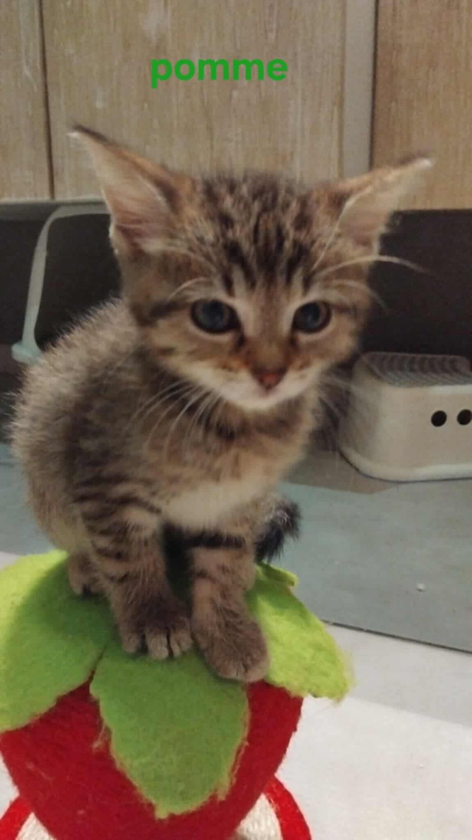 Petite sœur de Framboise, Pomme est issue de la même fratrie de 5 chatons ayant perdu leur maman trop tôt. Cela ne l’empêche pas d’avoir une personnalité bien affirmée et pleine de vie !