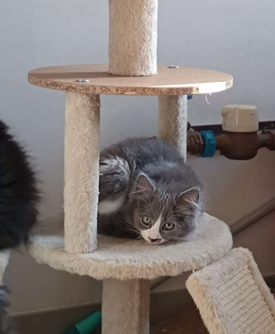 Je suis Poutchi, un magnifique chaton gris avec des touches de blanc, le bout de mon nez tout gris, je suis en grande forme et en bonne santé. Comme mon frère Toufu, je suis le deuxième petit turbulant et aime embêter gentiment mon frère et mes sœurs. Je suis très curieux et explore activement les nouvelles cachettes mais je reste quand même au départ sur mes gardes, j’aurais donc besoin de temps pour être totalement à mon aise. Je crois que l’extérieur pourrait être un bon terrain de jeu pour moi car j’adore explorer. Espiègle et plein d’énergie, je suis souvent de pair dans les jeux avec mon frère Toufu. J’apprécie également les jeux avec les humains. Je me laisse caresser et prend plaisir calmement à me faire peigner. J’ai besoin après de gros moments de jeu d’être au calme et tranquille pour me reposer et souvent je me retrouve aussi avec mon frère Toufu, qui se ressemble s’assemble. On aimerait avec mon frère trouver une famille qui nous accordera leur confiance à tous les deux. On sera complice et çà nous permettra de continuer à s’épanouir tous les deux à notre rythme. Je préfère trouver une famille sans enfant en bas âge, un endroit calme.