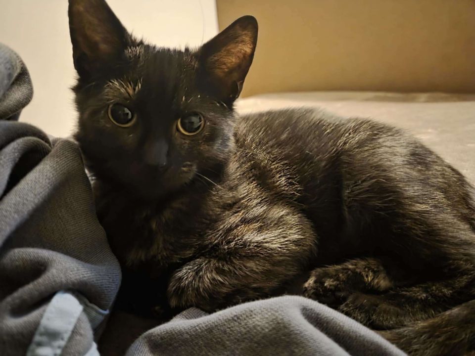 Raven – la panthère timide « Je suis une petite panthère noire avec des taches plus claires sur une patte arrière, un sourcil et autour d’un œil