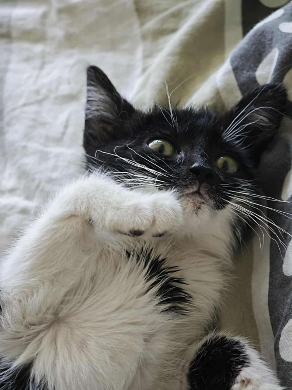 Ma famille d’accueil dit que je suis parfaite ! Aussi câline que jouette, je montre volontiers mon ventre pour demander des gratouilles 🥰