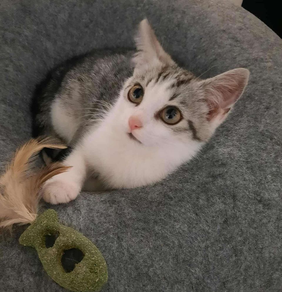 Tom est un magnifique chaton gris tigré avec de petites chaussettes blanches. C’est le plus grand des deux, mais aussi le plus timide. Un peu réservé au premier abord, il est d’une grande douceur, et très câlin une fois qu’il se sent en confiance.