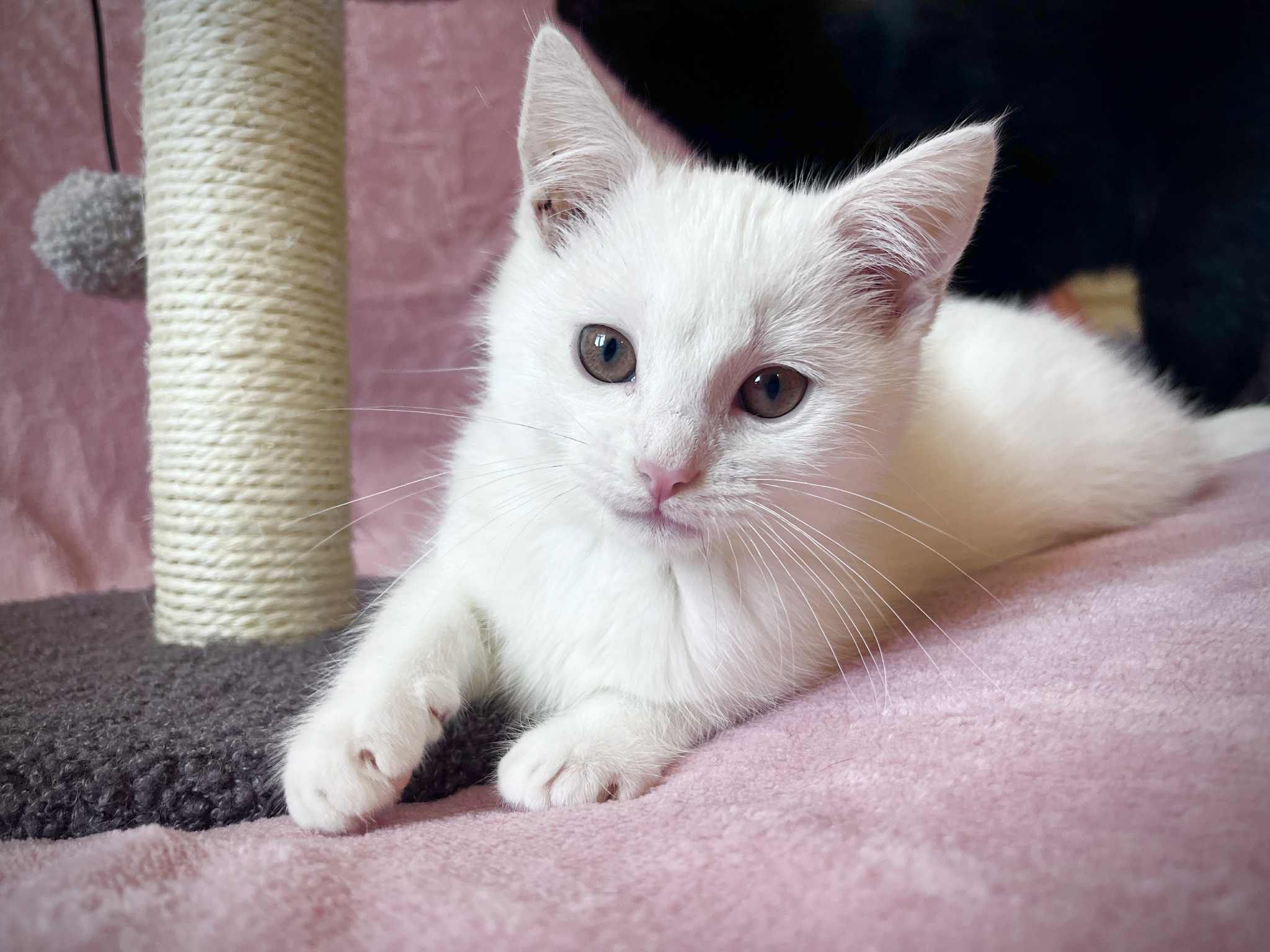 Je suis un bébé et j’adore découvrir, courir, jouer et surtout ennuyer gentiment les chats d’Amber. Je suis enfin prête pour mon adoption! J’aimerais un moins un(e) ami(e) chat parce que j’aime beaucoup jouer et interagir. J’ai besoin d’une famille qui soit attentive et qui ne laisse pas sortir les chats parce que j’ai une particularité: je suis sourde! Du coup les dangers de l’extérieur sont décuplés pour moi! À part ça, je vis ma vie normalement. Il faut juste apprendre à communiquer autrement. Dès que ma pote bipède se met dans le canapé je me met sur elle et je ronronne. Je suis une pot de colle et je regarde tout ce qu’elle fait😻.