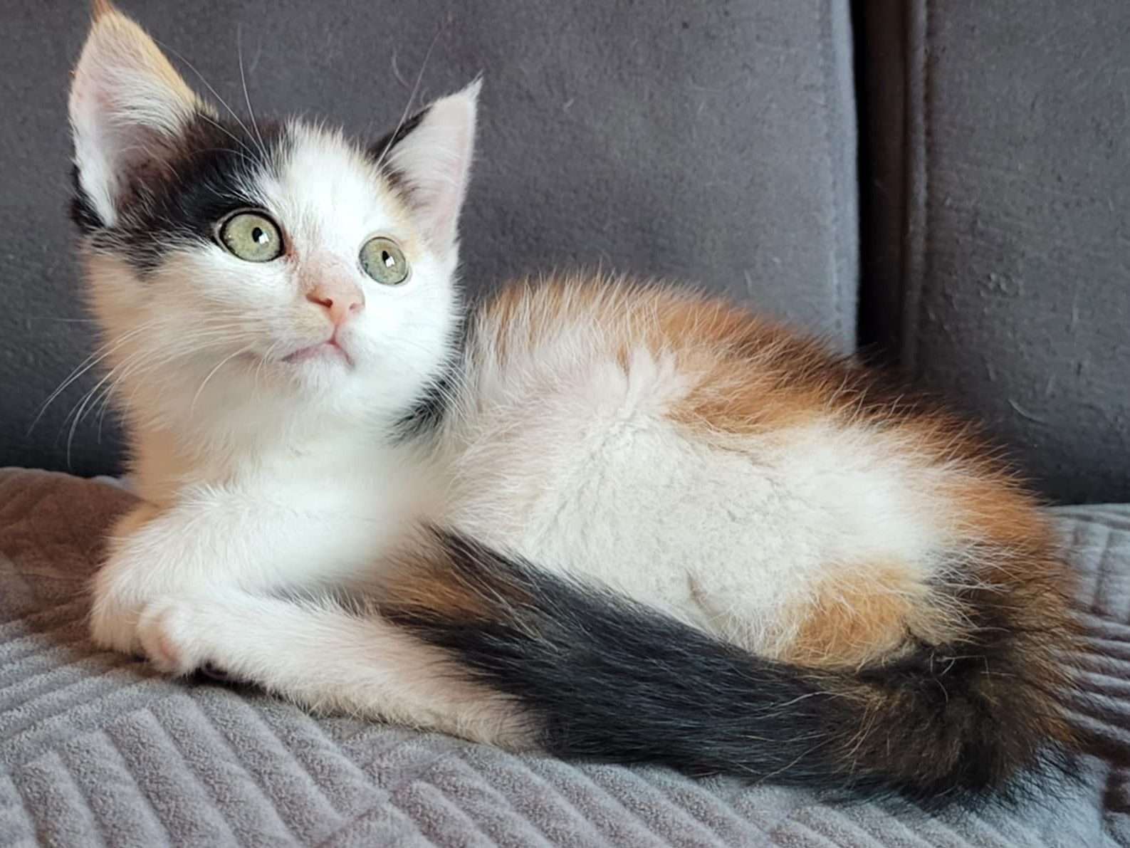 Coucou, moi c’est Dina. Je suis née le 3 août dans une remise abandonnée, d’une maman errante. J’ai été trouvée à 4 semaines avec mes frères et soeurs, malheureusement notre maman ne s’est pas laissée attraper. Nous n’étions pas encore sevrés mais après quelques jours de biberon j’ai commencé à manger toute seule. Je suis une petite chatte espiègle et vive et je joue comme une folle avec mes frères et sœurs. Tout est prétexte à courir et sauter partout, ma queue est une proie passionnante et je fais plein de bêtises.