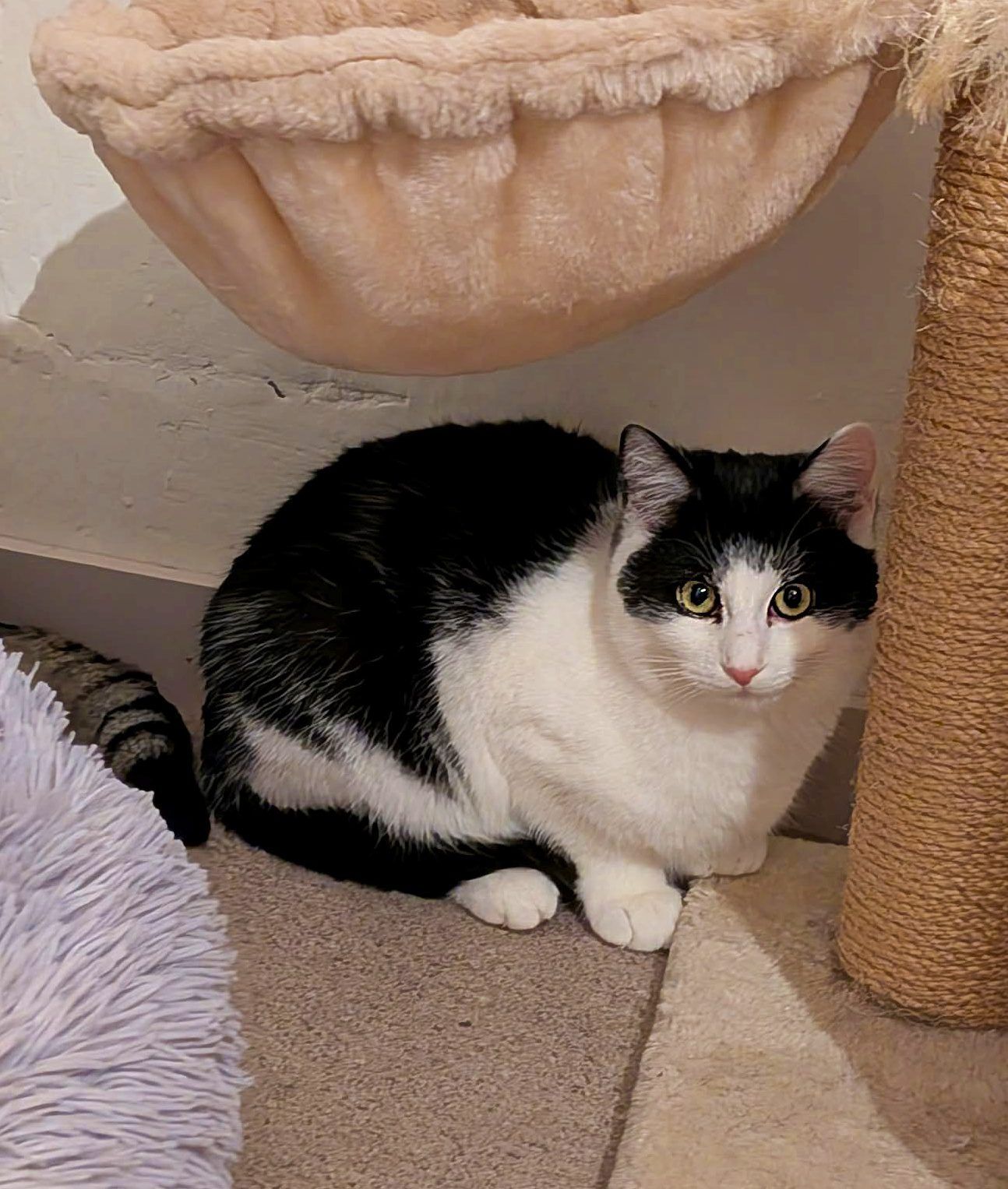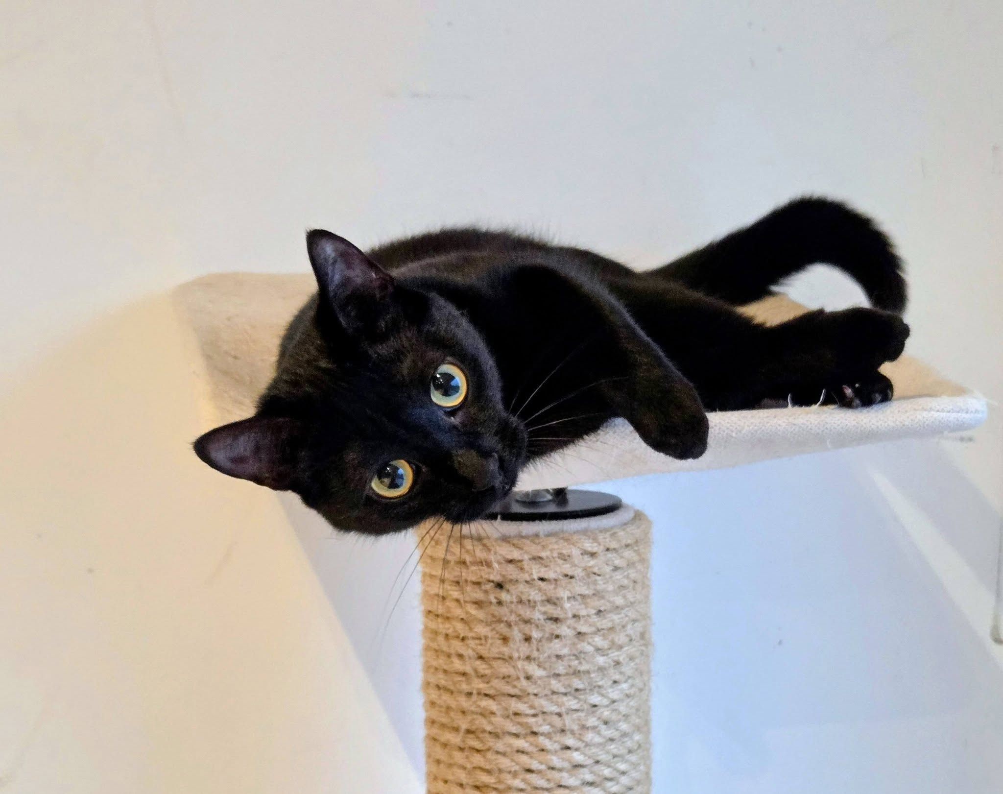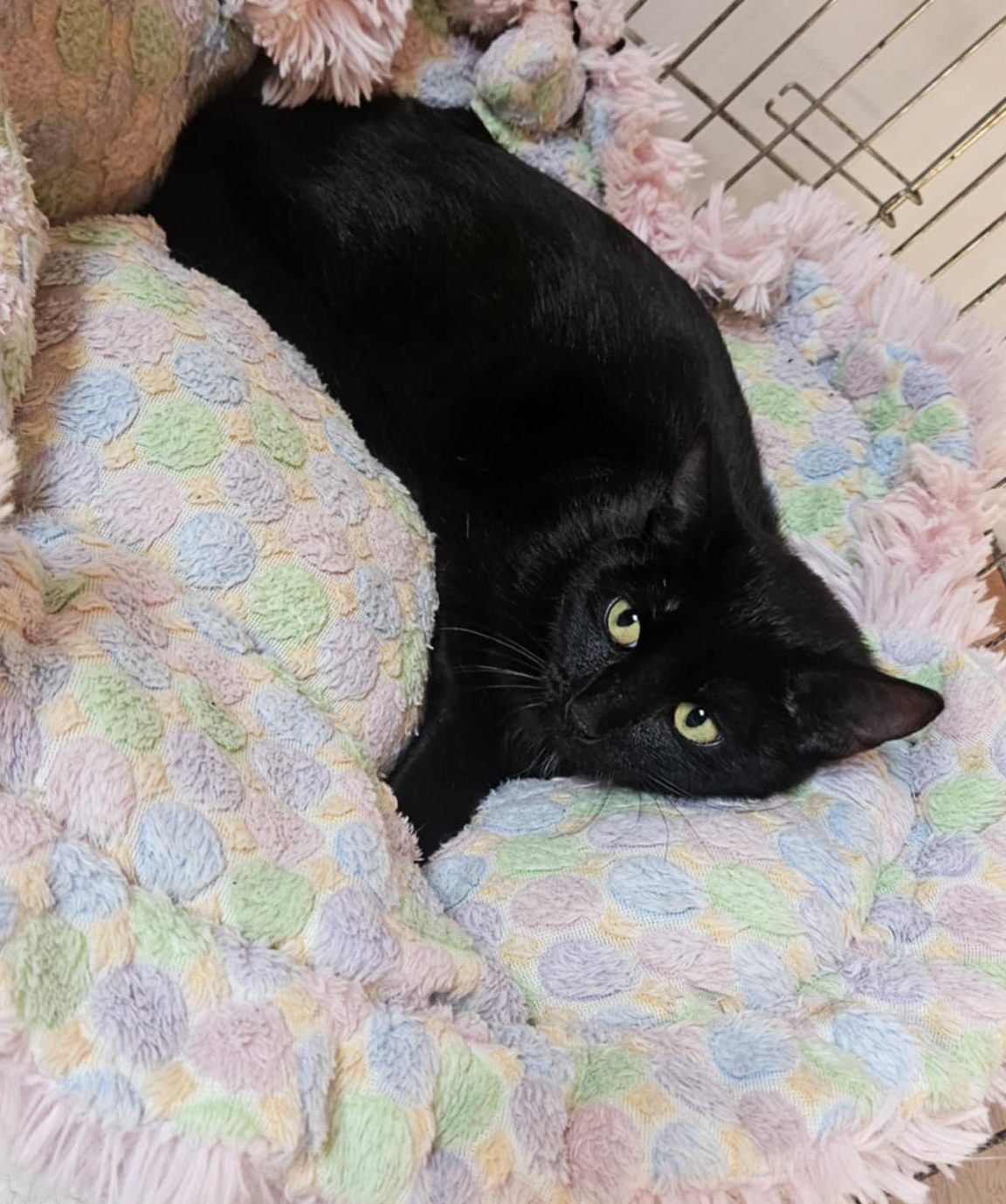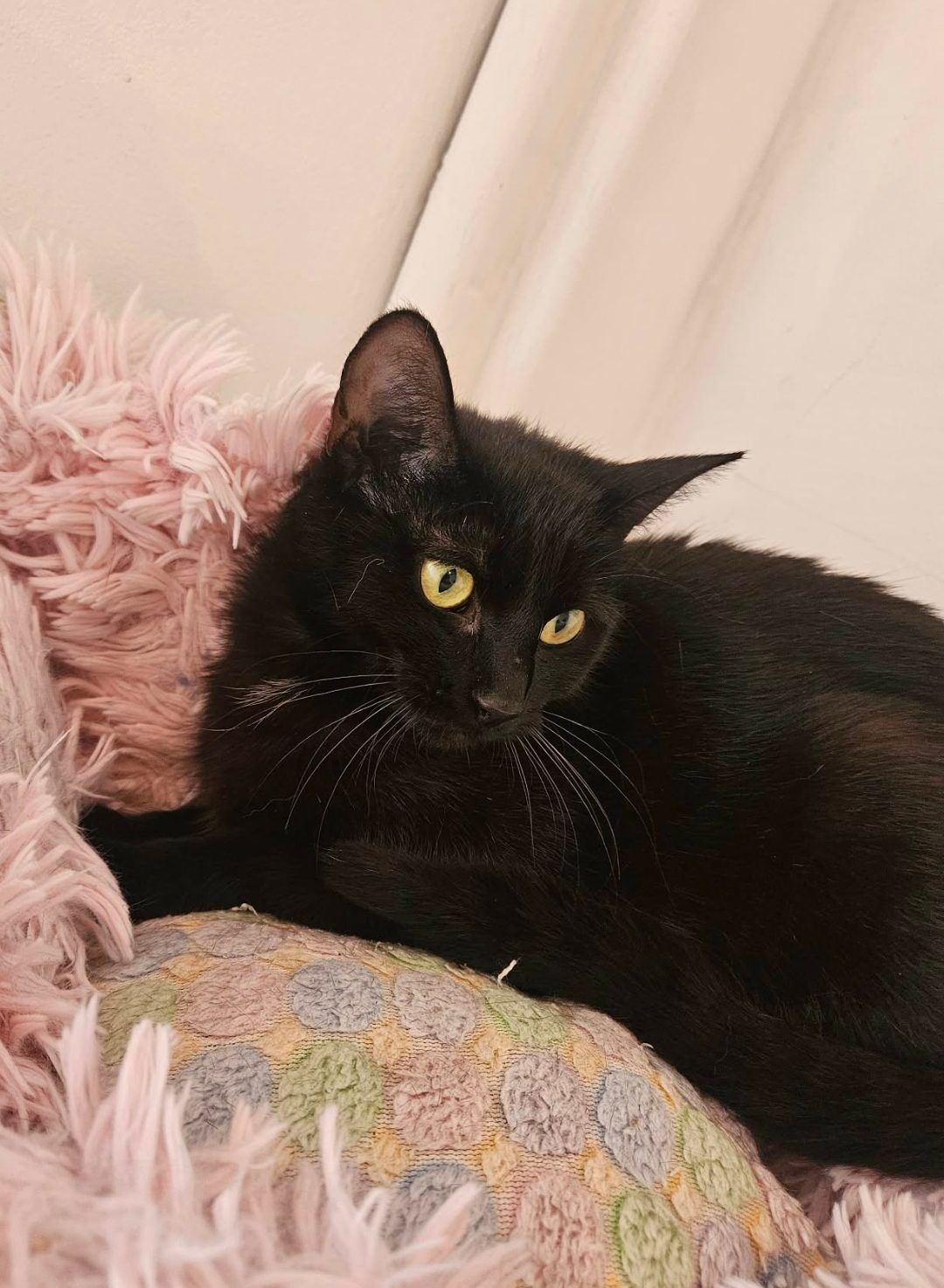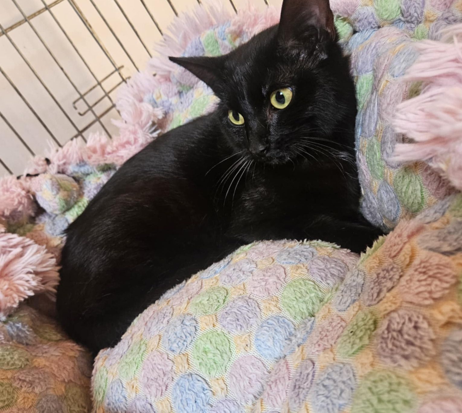 Voici Kitty, une adorable petite chatte noire au regard tendre, ornée d’une jolie tache blanche sur le cou qui la rend encore plus unique. Âgée d’à peine 1 an, elle a toute la vie devant elle pour offrir amour et douceur