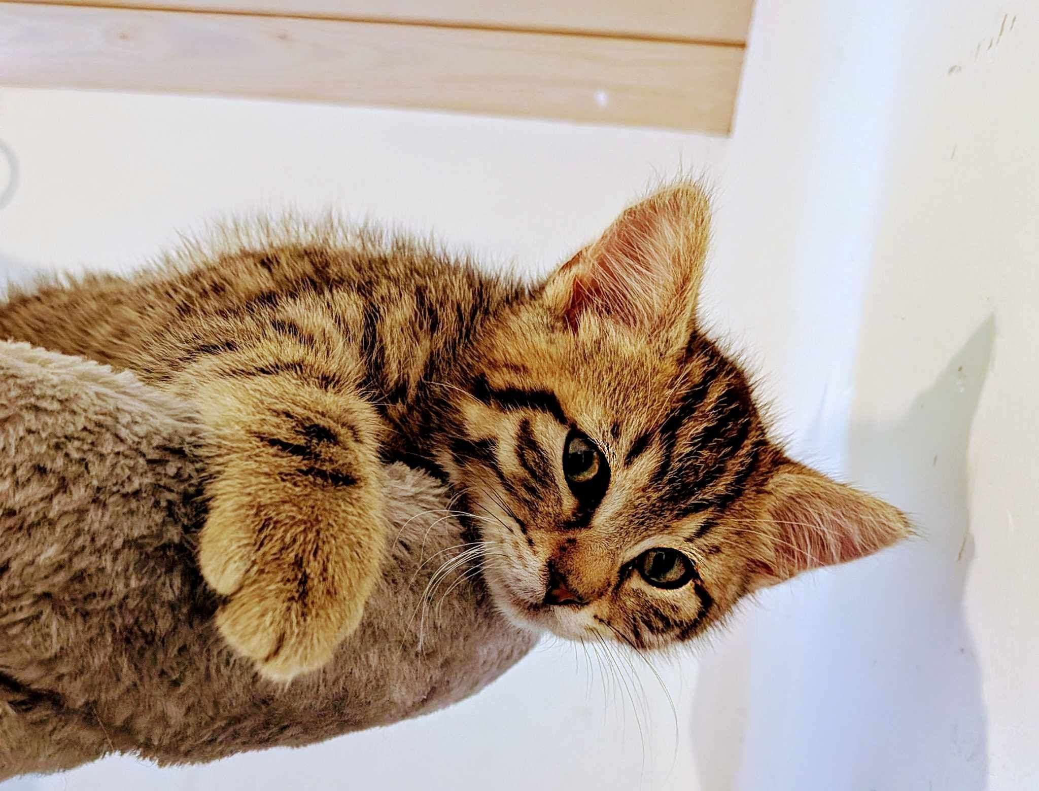 Tous les 3 ont fait des courses poursuites, on dort ensemble (et quand c’est possible dans le lit de notre maman d’accueil). Comme nous avons été biberonnés, on n’a pas les codes…une sortie extérieure serait trop dangereuse pour nous. On a évidemment besoin de beaucoup de compagnies, Ficelle a tendance à aimer grimper sur les épaules des humains, moi je suis légèrement plus calme et toujours à l’affût d’une caresse.